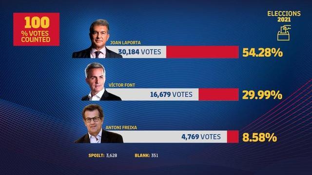 JRS直播网3月8日讯 据巴萨官方消息,拉波尔塔在主席大选中击败了弗雷萨和丰特,第二次担任俱乐部主席。