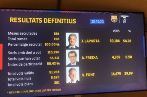 JRS直播网讯 北京时间3月8日,巴萨大选正式落幕,投票的结果也已经出炉,巴萨官方宣布,最终拉波尔塔击败弗雷夏和冯特,当选巴萨新一届主席,拉波尔塔时隔11年再度执掌俱乐部,此前他是2003年当选为巴萨主席,2010年离任,期间缔造了巴萨梦二、梦三王朝。同时拉波尔塔这也是巴萨121年队史的第42位主席,恭喜。