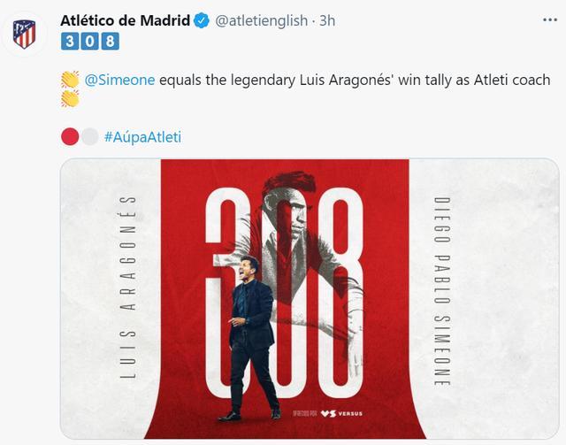 JRS直播网3月1日讯 据马竞官方数据统计,西蒙尼作为马竞主帅已带队赢得308场胜利,追平传奇教头阿拉贡内斯并列队史第一。