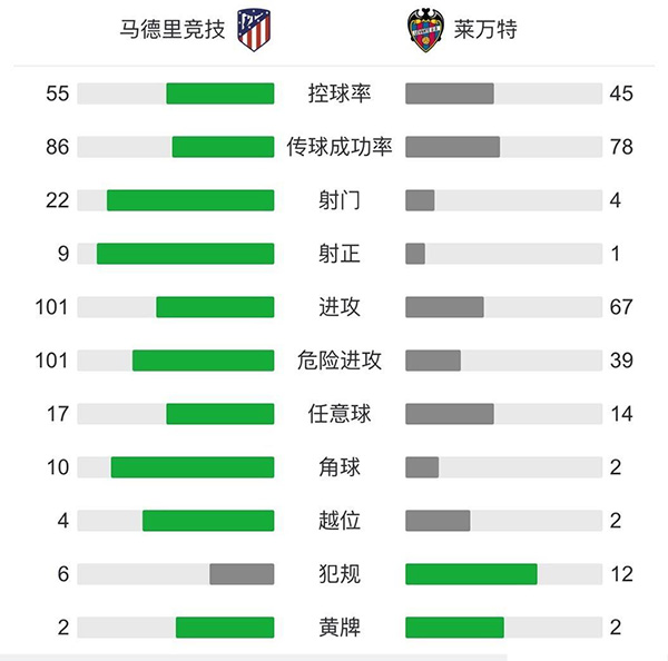 查看:马德里竞技vs莱万特 全场录像技术统计: