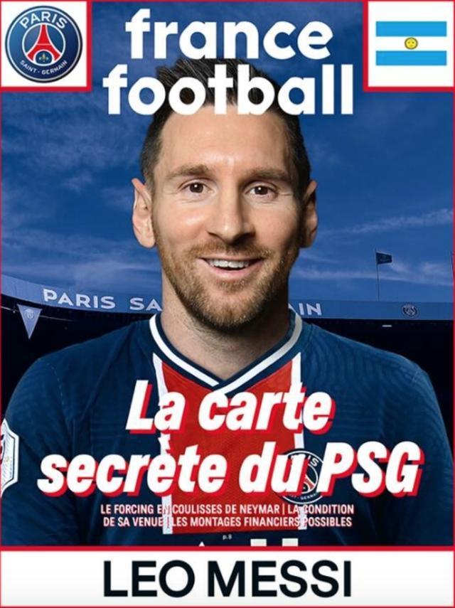 图片上梅西灿烂的笑着,《法国足球》配文道:巴黎的秘密王炸。