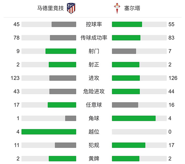 查看:马德里竞技vs塞尔塔 全场录像技术统计: