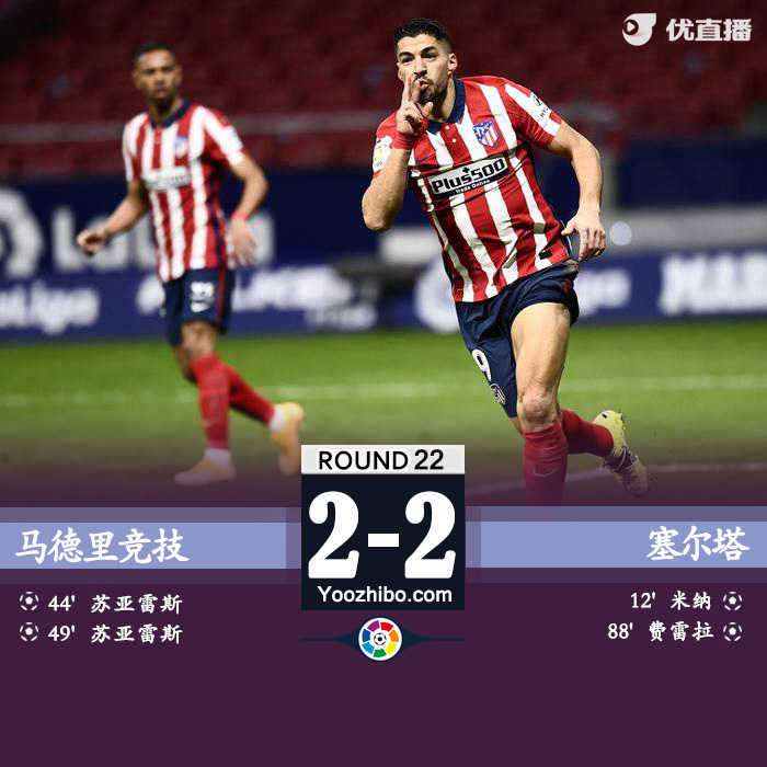 JRS直播网讯:北京时间2月9日4:00,西甲第22轮,马德里竞技主场迎战塞尔塔。上半场,米纳头球破门,科雷亚打门偏出,苏亚雷斯铲射破门。下半场,洛迪助攻苏亚雷斯梅开二度,法昆多-费雷拉打进绝平进球,最终,马竞2-2塞尔塔,联赛八连胜遭终结。