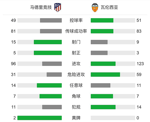 查看:马德里竞技vs瓦伦西亚 全场录像技术统计: