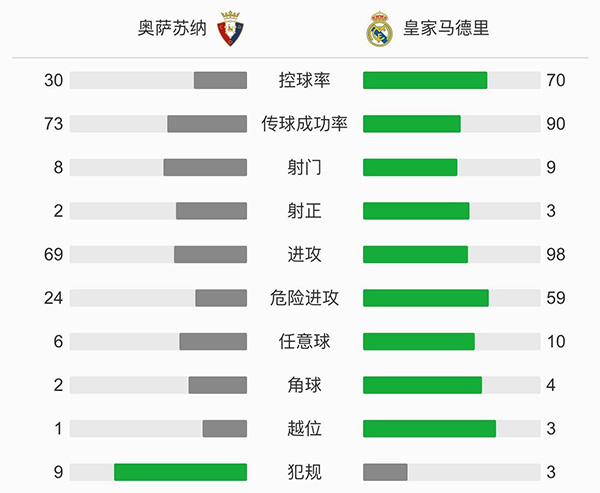 查看:奥萨苏纳vs皇家马德里 全场录像技术统计:
