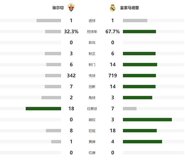 查看:埃尔切vs皇家马德里 全场录像技术统计: