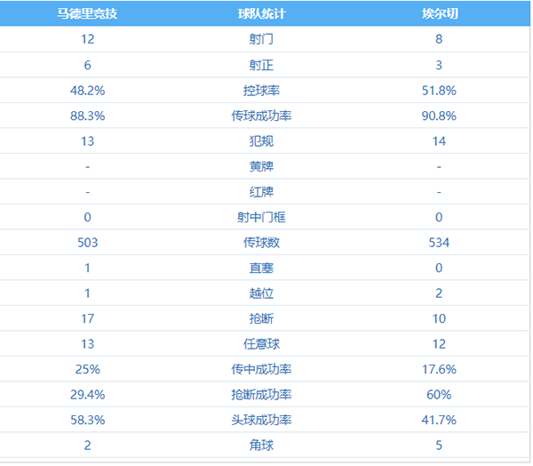 查看:马德里竞技vs埃尔切 全场录像 技术统计: