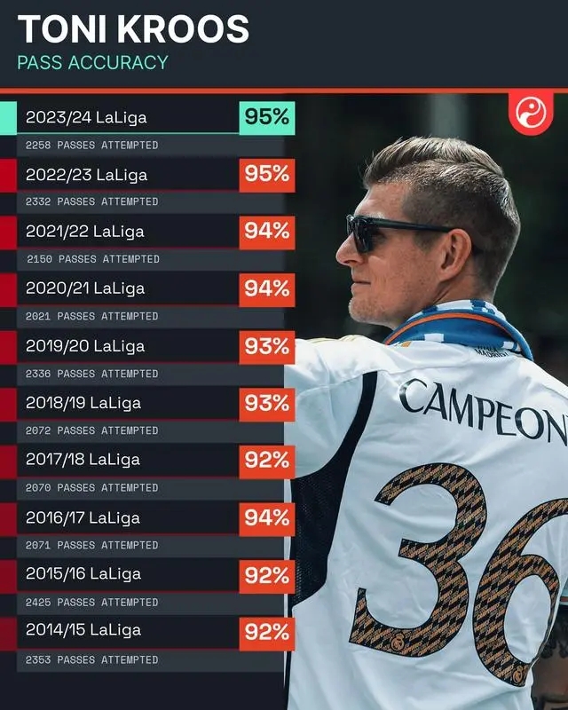 自2024-15赛季以来,克罗斯在西甲的赛季传球成功率从未低于90%,他已经连续10个赛季将这一数据保持在92%以上,近两个赛季甚至都达到了95%。