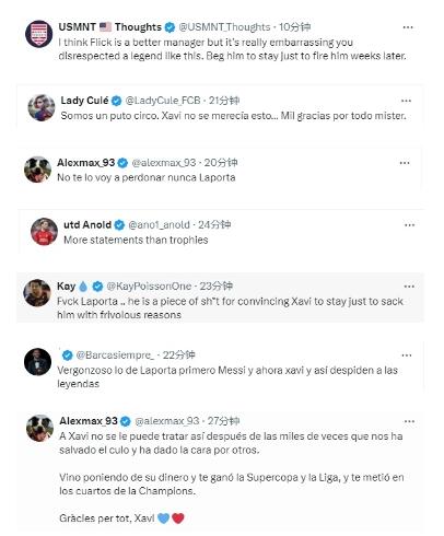 还有人为哈维鸣不平:“哈维屡次挺身而出拯救我们,我们不能这样对待他。”:“巴萨已经沦为马戏团俱乐部,作为队史传奇,哈维不该受到这样的待遇,非常感谢你所做的一切!”:“或许弗里克是更适合巴萨的主教练,但你这样不尊重队史传奇实在令人尴尬。恳求他留下,几周后却炒了他鱿鱼!”