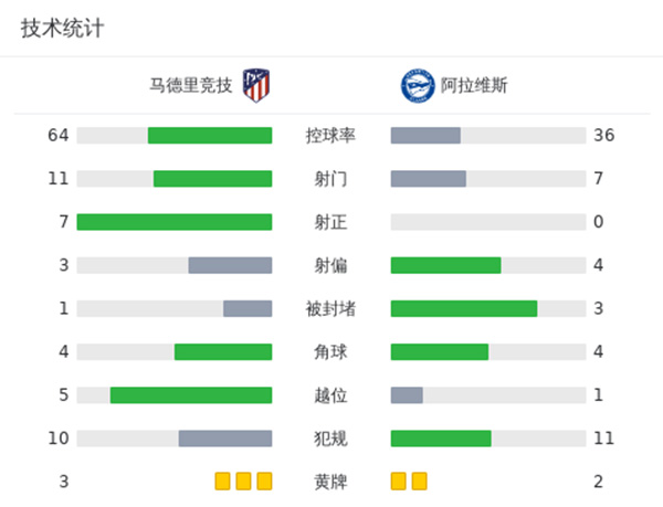 全场比赛结束,马竞2-1阿拉维斯。