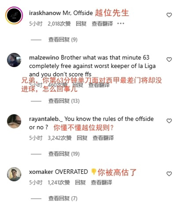 还有球迷甚至认为姆巴佩能力不够配不上皇马,要求俱乐部解雇他:“我对你非常失望!”;你杀死了比赛,表现真的太糟糕了!”;“你的水平配不上为皇马踢球!”:“皇马需要解雇你!”;“滚回农民联赛踢球吧,西甲不是你能达到的水准!”;“你的水平变得越来越低了,我希望你能远离金钱的诱惑,因为它们会像抛弃其他人一样,最终抛弃你!”