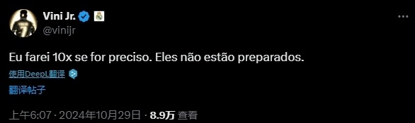 在刚结束的金球奖评选中,作为夺奖最大热门的维尼修斯,最终意外败给曼城后腰罗德里,屈居第2位,无缘时隔17年为巴西再次夺得金球奖。随后他第一时间在社交媒体发文,若有所指的表示:“如果有必要我会付出10倍努力,他们还没准备好。”