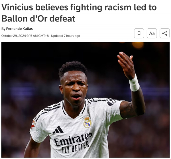 JRS直播网讯北京时间10月29日,来自权威外媒路透社的消息,刚无缘金球奖的皇马射手维尼修斯再次发声,他自认为打击种族歧视的激进主义,直接导致了自己无缘金球奖。