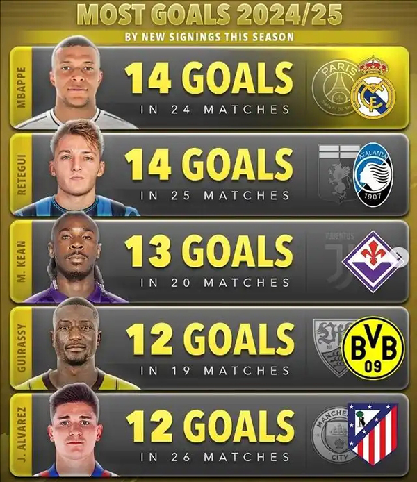 JRS直播网讯Score90统计表明,姆巴佩是2024-25赛季进球最多的新转会球员。