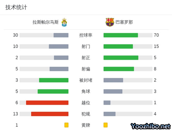 最终巴萨2-0客胜拉斯帕尔马斯。积分榜方面,巴萨联赛五连胜1分优势领跑。