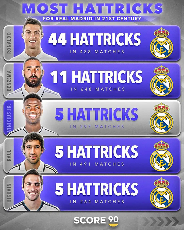 JRS直播网讯21世纪皇马球员戴帽次数TOP10: