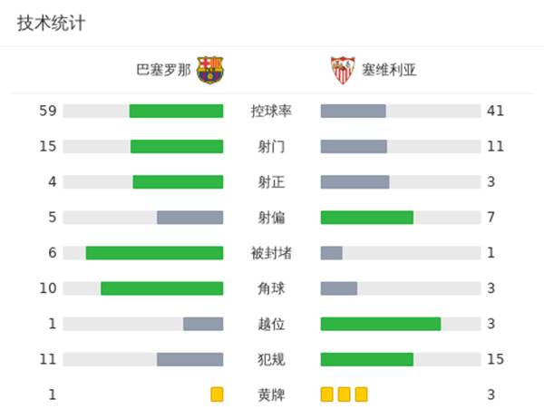 全场比赛结束,最终巴萨1-0塞维利亚。