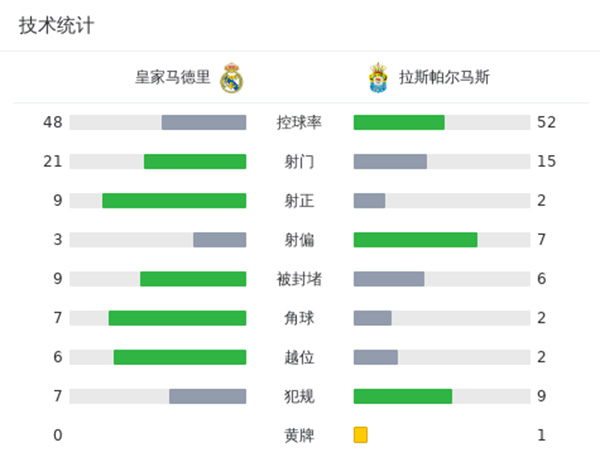 全场比赛结束,最终皇马2-0拉斯帕尔马斯。