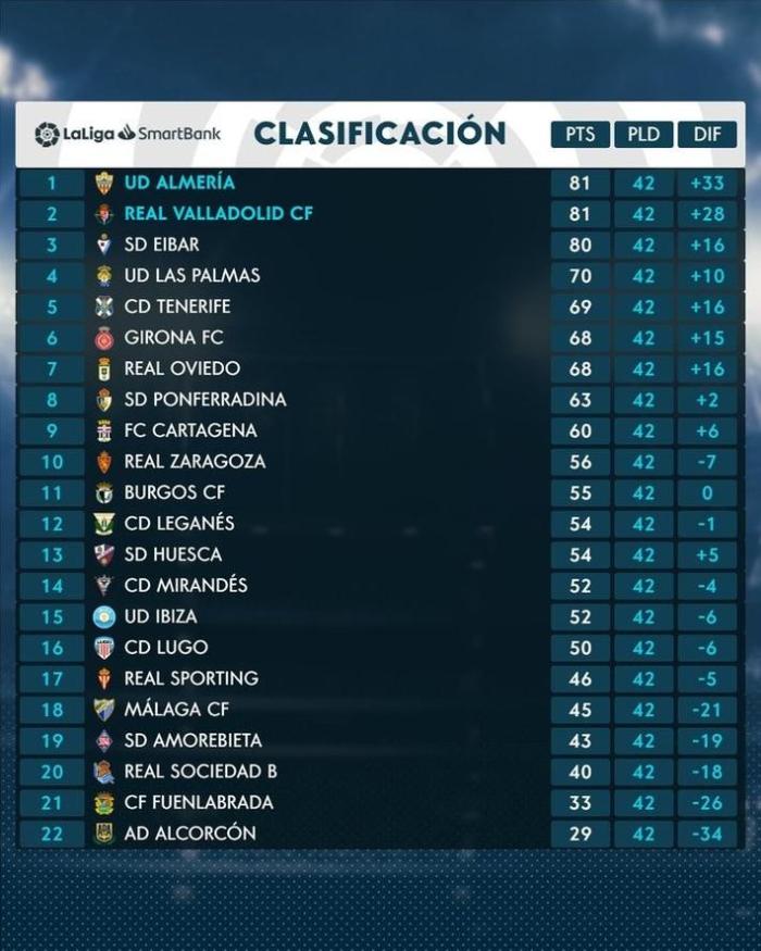JRS直播网05月30日讯 西乙联赛今天落下帷幕,阿尔梅里亚和巴拉多利德直接获得升级资格,而有4支球队则需要参加升级附加赛。