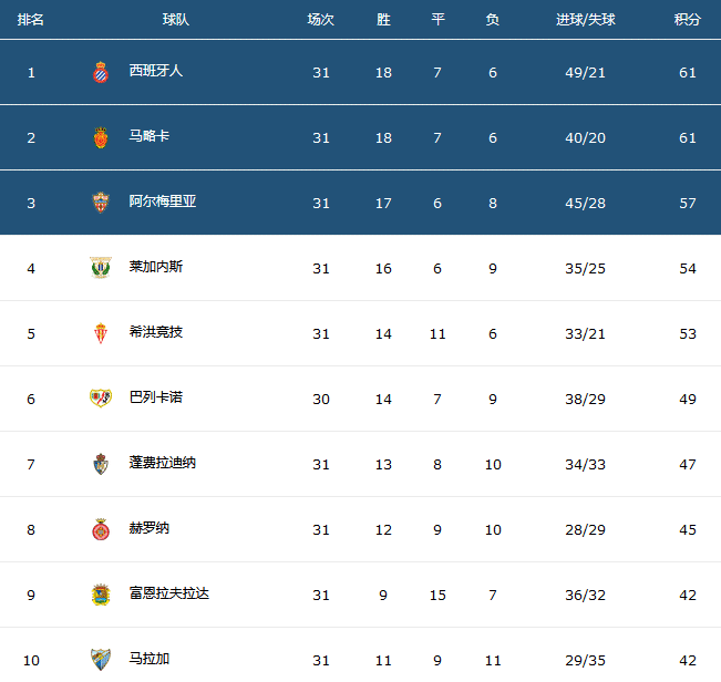 JRS直播网3月30日讯2021年3月底,西乙联赛已经完成了第31轮的所有比赛,积分榜形势突变,最近一度跌出积分榜前二即直接冲甲区的西班牙人意外逆袭重夺榜首位置,这种逆袭一方面是西班牙人自身近期的两连胜,一方面则是西班牙人4大冲甲死敌的雪崩间接保送西班牙人夺取榜首。