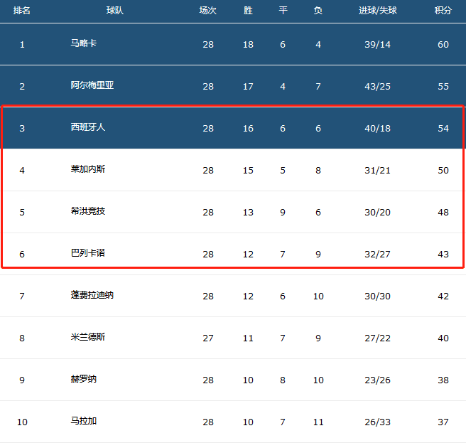 JRS直播网3月8日讯 西乙联赛战至第28轮,积分榜前六也是冲甲区的6支队伍全部完成了本轮比赛,排名第一的马略卡2-1绝杀卡塔赫纳拿到了3分,以60分领跑西乙积分榜;排名第二阿尔梅里亚1-0战胜了赫罗纳,从而超越西班牙人跻身积分榜第二名,积分55分;排名第三的西班牙人1-1被皇家奥维耶多逼平,从而在后半程7轮遭遇2胜3平2负的滑铁卢,冲甲雪崩跌至第三名。