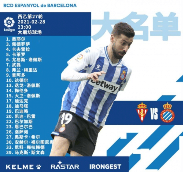 JRS直播网2月28日讯 西班牙人队通过官方公布了西乙第27轮客场挑战希洪竞技的比赛球员大名单,这其中武磊继续入选,而球队的主力前锋德托马斯这场比赛将会缺席,这也让武磊有了重新为球队参赛的机会,毕竟武磊已经连续3场比赛都没有出场了,枯坐板凳席270分钟,他确实需要机会来证明自己。