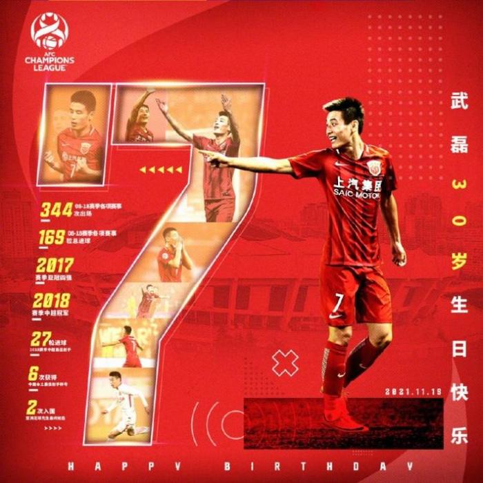 JRS直播网11月19日讯 亚冠官博写道:“队史中超首冠、跻身亚冠四强、27球斩获中超金靴……从崇明岛走出的青涩少年,现在已是名震亚洲的锋线尖刀。胜广州破水原克东京,难忘那一抹红衫。祝武磊30岁生日快乐!”