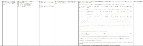 JRS直播网12月11日,亚足联公布了对亚冠第5轮浙江队VS武里南队赛后的冲突处罚。浙江队5人被处罚,6号姚均晟禁赛8场、19号董宇禁赛6场、45号莱昂纳多禁赛8场、技术分析师王剑禁赛6场。浙江队助教哈维尔-佩雷斯-阿尔马尔扎被禁赛1场,罚款1000美元。此外,浙江俱乐部还被罚款1万美元。
