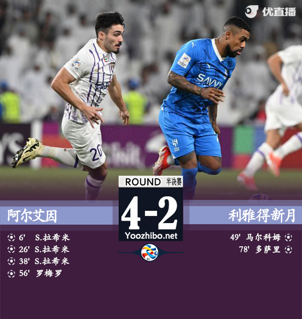利雅得新月2-4阿尔艾因 拉希米帽子戏法,卡库点射破门