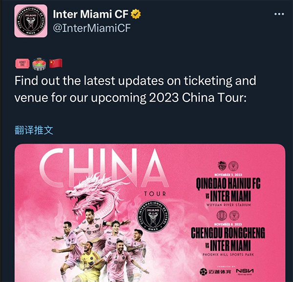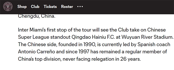 同时海牛还引发乌龙,迈阿密国际官方宣布,球队将在11月5日在海口对阵青岛海牛,报道称从1997年起,青岛海牛始终在中国足协顶级联赛中占据一席之地,已连续26年没有降级。很显然迈阿密国际整错了,成立30年的青岛海牛在2013年和2016年,分别降入中甲和中乙。