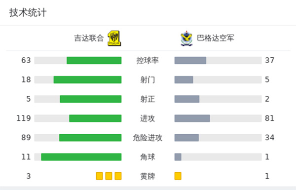 全场比赛结束,吉达联合1-0巴格达空军。