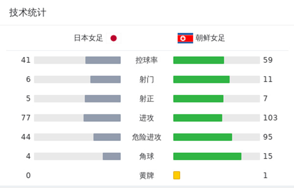 关键事件: 第10分钟,山本柚月一脚高质量的长传打穿朝鲜队后防,中嶋淑乃单刀机会跟进冷静挑射入网,日本女足1-0领先↓ 第38分钟,催金玉送出直塞,魏正心横传门前,金景英中路包抄低射破门,朝鲜队1-1扳平比分↓ 第66分钟,日本队开出角球,下半场替补登场的大泽春花鬼魅跑位头槌破门!日本2-1再次超出比分↓ 第70分钟,大泽春花禁区外横向做球,谷川萌萌子得球调整后直接起脚远射,皮球被门将托一下后仍直入网窝,日本连进2球3-1领先↓ 第72分钟,日本队过顶长传发动进攻,千叶玲海菜高速推进长驱直入单刀得分,日本队6分钟内连进3球!4-1锁定胜局! 最终全场比赛结束,日本女足4-1朝鲜女足。