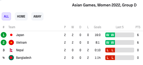 2轮过后,日本女足和越南女足都是2连胜,但日本女足凭借净胜球优势领跑,尼泊尔和孟加拉国都是2连败积0分。