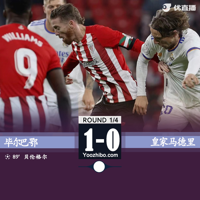 JRS直播网2月4日讯 北京时间2月4日凌晨4点30分,2021-22赛季西班牙国王杯1/4决赛在圣马梅斯球场展开角逐,皇家马德里客场挑战毕尔巴鄂竞技。上半场双方均无建树,下半场卡塞米罗失良机,皇马后场连续失误致丢球,贝伦格尔绝杀。最终皇家马德里客场0-1负于毕尔巴鄂竞技,皇马无缘国王杯四强。