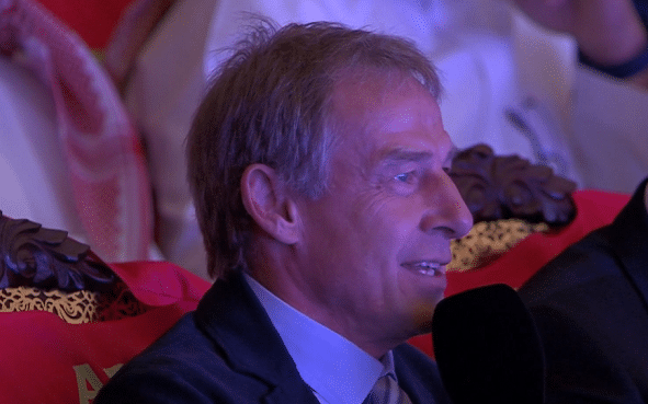 韩国队主帅是克林斯曼,德国传奇、“金色轰炸机”,他执教的韩国队被分在了E组,同组的有马来西亚、约旦和巴林。对于克林斯曼来说这样的分组绝对是上上签,所以看到签位的克林斯曼也笑了,对于抽签很满意。