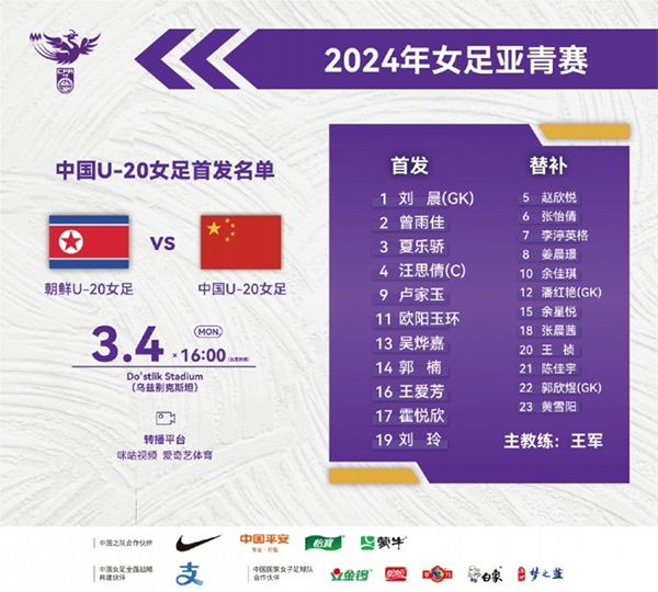 JRS直播网3月04日讯16点,2024年U20女足亚洲杯(女足亚青赛)B组首轮一场焦点战打响。中国U20女足将迎来首个对手朝鲜队,而本场比赛,U20女足的首发阵容也已经出炉。