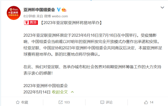 JRS直播网05月15日讯 消息,2023年亚洲杯组委会官方宣布,因为疫情影响,2023年亚洲杯将易地举办,新的举办地点有待确认。对于中国足球来说,这是一个遗憾,毕竟时隔19年,原本中国男足可以在家门口再次出战亚洲杯,但是受到各方面因素影响,亚洲杯将无法在中国举办。