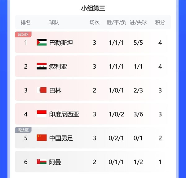 而更令中国球迷失望的是,国足不仅没能小组出线,战绩还是6个小组第3名中最差的。虽然阿曼与吉尔吉斯斯坦的比赛还未进行,但不论那场比赛的结果如何,那一组的小组第3成绩也将超过中国队。而同样末轮未踢的巴林队,已经凭借3分力压中国男足。