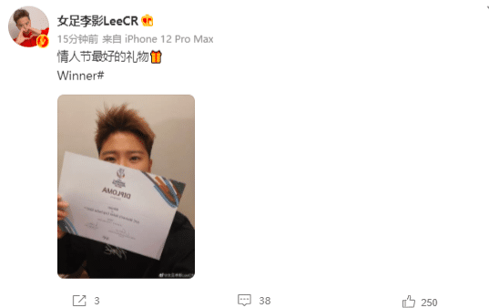 北京时间今天,女足前锋李影晒出亚洲杯冠军证书,并发文:“情人节最好的礼物,冠军”