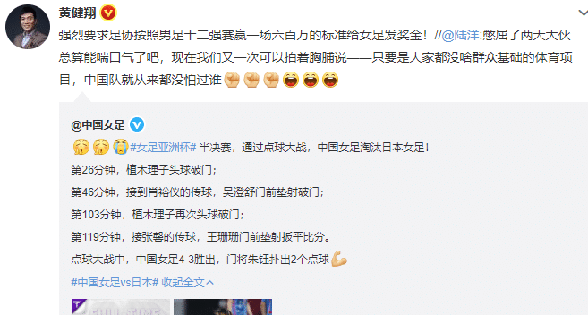 知名足球人黄健翔在中国女足晋级亚洲杯决赛之后也呼吁:“强烈要求足协按照男足十二强赛赢一场六百万的标准给女足发奖金!”