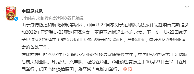 中国足球队官方微博宣布,由于疫情防控和航班限制等原因,中国U-22国家男子足球队无法按计划赴塔吉克斯坦参加2022年亚足联U-23亚洲杯预选赛,不得不遗憾退出本次比赛。下一步,U-22国家男子足球队将继续在主教练亚历山大·扬戈维奇的带领下,严格训练,做好2022杭州亚运会的备战工作。