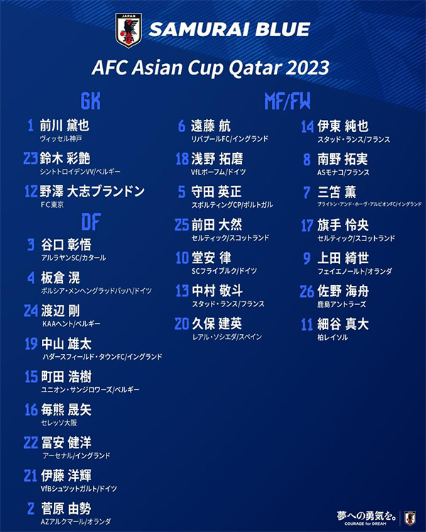 JRS直播网01月02日讯 ,日本男足公布了亚洲杯的26人名单。久保建英、远藤航、富安健洋等20位效力欧洲五大联赛的球星入选。而古桥亨梧、镰田大地、田中碧三位效力欧洲联赛的名将则意外落选,效力于英超布莱顿的三笘薫则是带伤入选。