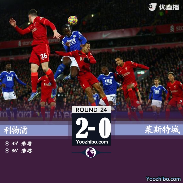 JRS直播网2月11日讯 北京时间2月11日凌晨3:45,2021-22赛季英超联赛第24轮,利物浦坐镇安菲尔德球场迎战莱斯特城。上半场,若塔补射破门,利物浦1-0领先莱斯特城;下半场萨拉赫失单刀后兜射中框,若塔再次进球完成双响,最终利物浦2-0击败莱斯特城取联赛三连胜,继续排在积分榜次席。