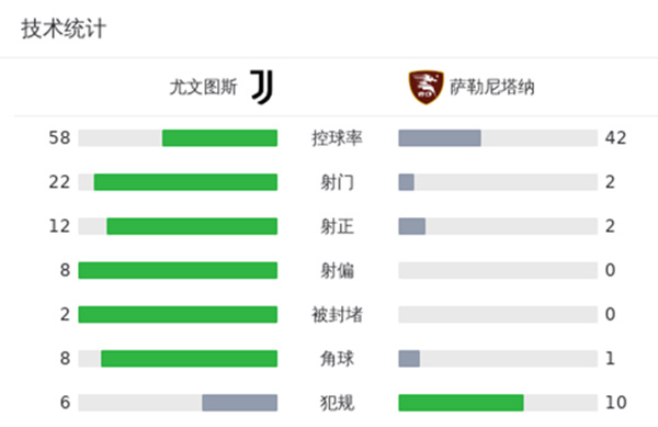 第54分钟,基耶萨左路摆脱传中,米利克头球攻门被菲奥里洛扑出,鲁加尼补射得分,尤文3-1萨勒尼塔纳!