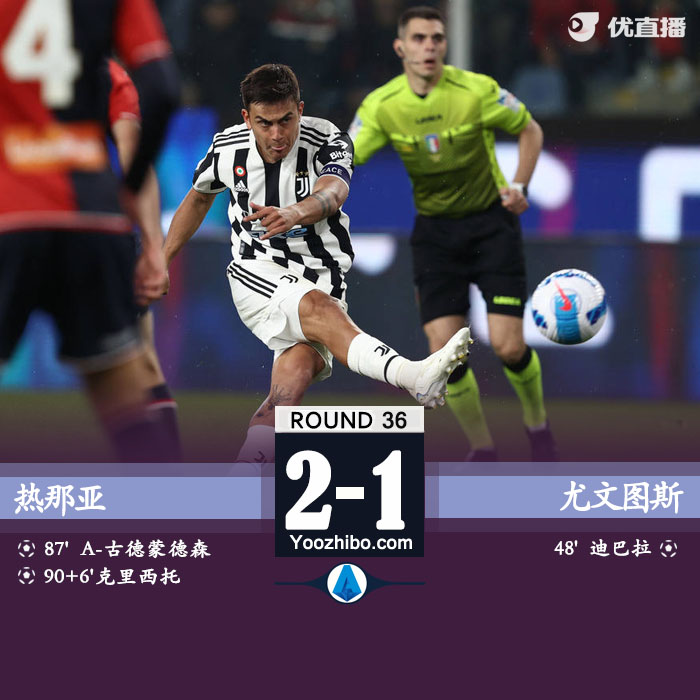 JRS直播网讯5月7日讯 北京时间5月7日03:00,意甲第36轮,尤文客场迎战热那亚。上半场比赛,弗拉霍维奇禁区内横传造险,阿图尔和鲁加尼均染黄,半场战罢,双方0-0战平。下半场比赛,迪巴拉兜射破门,基恩近距离打门被门将神勇扑出,古德蒙德松扳平,补时阶段基恩错失空门良机,克里希托点射绝杀。全场比赛战罢,尤文1-2热那亚。