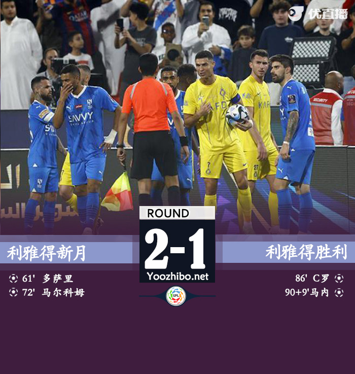 JRS直播网讯:北京时间4月9日沙超杯半决赛,利雅得新月主场对阵利雅得胜利。上半场奥斯皮纳连续做出关键扑救,C罗连续多脚打门造险,下半场达瓦萨里首开记录,马尔科姆头球破门,C罗染红离场,马内最后时刻扳回一球。最终比分利雅得新月2-1利雅得胜利。