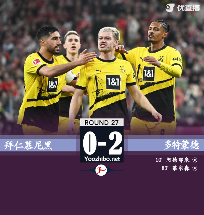 JRS直播网讯: 北京时间3月31日01:30,德甲第27轮迎来德国国家德比,拜仁慕尼黑坐镇主场慕尼黑安联球场迎战多特蒙德,本场主裁判为奥斯默斯。上半场,布兰特反击助攻阿德耶米小角度破门,凯恩失良机。下半场,阿莱助攻瑞尔森破门,凯恩扳回一城越位无效。最终,多特客场2-0力克拜仁,终结对阵拜仁连续11场不胜。