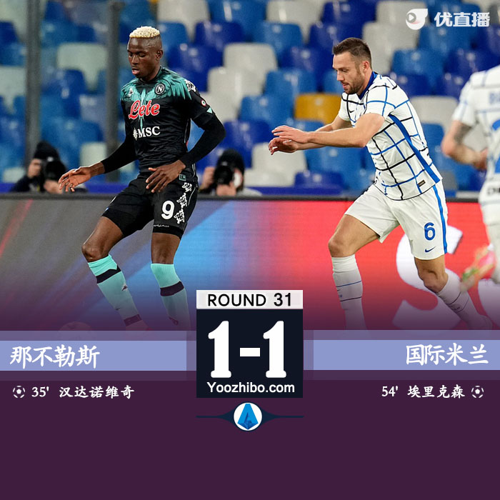 JRS直播网4月19日讯 北京时间4月19日凌晨2点45分,2020-21赛季意甲第31轮焦点战在马拉多纳球场展开角逐,那不勒斯坐镇主场迎战国际米兰。上半场卢卡库两次中框,汉达诺维奇乌龙球,下半场埃里克森远射扳平,波利塔诺中框。最终国际米兰客场1-1战平那不勒斯,国米联赛11连胜遭终结。积分榜方面,国米积75分以9分优势领跑,那不勒斯积60分位居第5名。