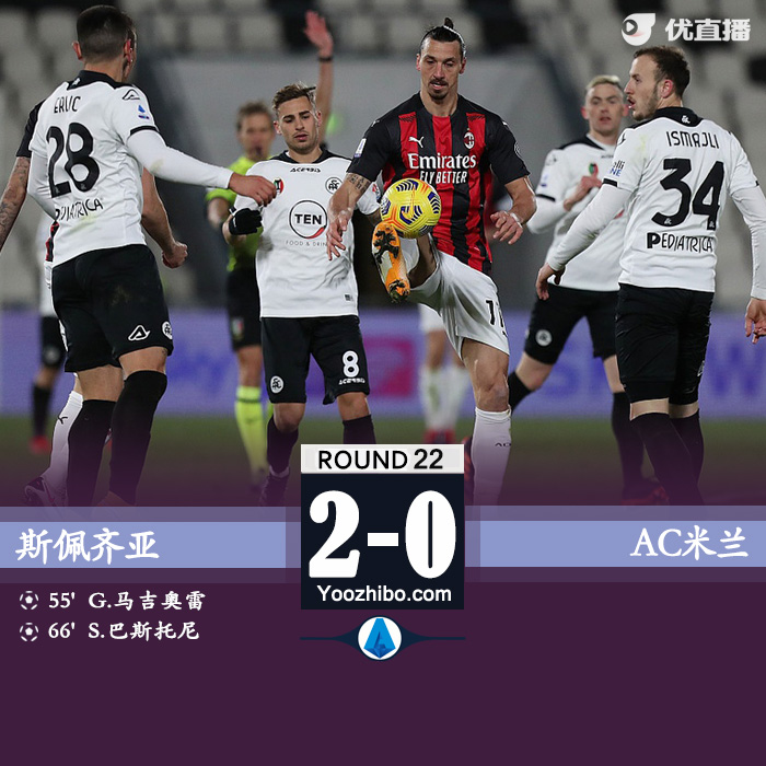 JRS直播网2月14日讯 北京时间2月14日03:45,意甲第22轮斯佩齐亚主场迎战AC米兰。上半场比赛,AC米兰无明显机会0射正。下半场,马吉奥雷首开记录,巴斯托尼世界波破门,AC米兰全场零射正。最终,AC米兰客场0-2不敌斯佩齐亚,球队2连胜终结,暂时仍以2分优势领跑积分榜。