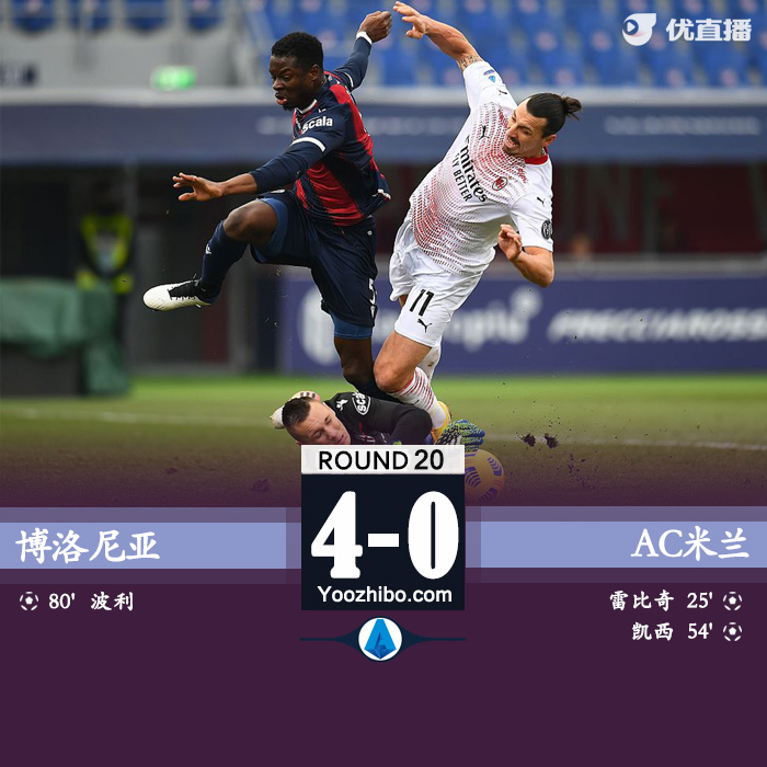 JRS直播网1月30日讯 北京时间1月30日晚22点整,2020-21赛季意甲第20轮在内拉托-达拉亚球场展开角逐,AC米兰客场挑战博洛尼亚。上半场伊布失点,雷比奇补射建功,下半场凯西点射扩大比分,波利面对旧主破门。最终AC米兰客场2-1战胜博洛尼亚,米兰连续17个意甲客场不败刷新纪录。积分榜方面,米兰积46分继续领跑。